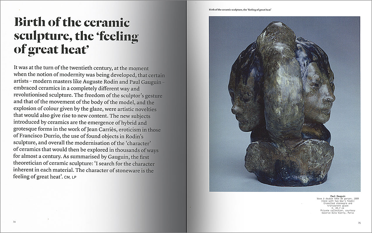 La muestra y, como hemos dicho, el catálogo, se estructura de forma cronológica y temática. Por ejemplo, una de las salas ofrece un panorama cronológico sobre el uso de la cerámica en la historia del arte europeo, los Estados Unidos y Japón, mientras otras salas se centran en diferentes temas, como el origen de la cerámica escultórica, con obras de artistas como Rodin y Gauguin; el grupo Otis, de California, con Peter Voulkos, Ken Price o John Mason; también encontraremos una sala (o capítulo en el catálogo) dedicada a Picasso, Ai Weiwei, Anne Wenzel y Edmund de Waal, con el nombre de “Drop the vase, break the plate”. También encontraremos un numero de capítulos monográficos sobre las salas en las que los propios artistas (los que pudieron) colaboraron con los comisarios para crear espacios personales, en estas salas encontraremos obras de Katinka Bock, Johan Creten, Eduardo Chillida & Antoni Tàpies, Leiko Ikemura, Klara Kristalova, Luigi Ontani, Elsa Sahal y Thomas Schütte.
