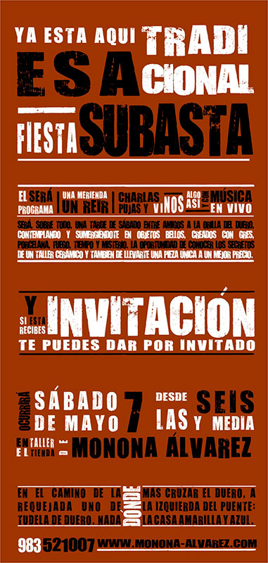 El sábado 7 de mayo a partir de las 6 de la tarde se celebrará en la casa-taller de la ceramista Monona Álvarez una subasta de sus propias piezas, que es además una ocasión de pasar una tarde entre cerámica, ceramistas, comer, charlar y conocer el taller.
