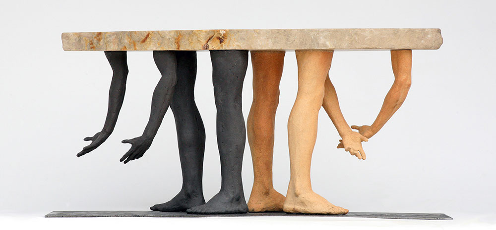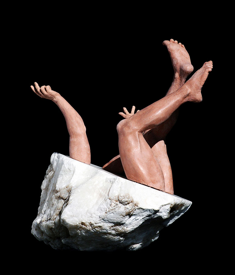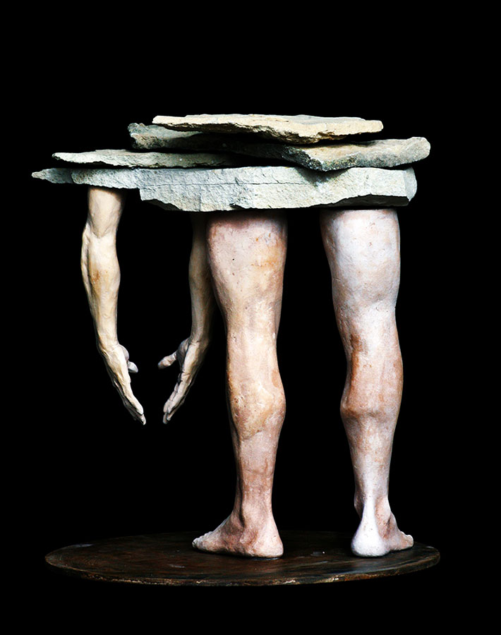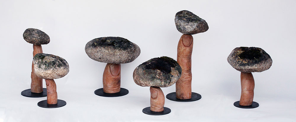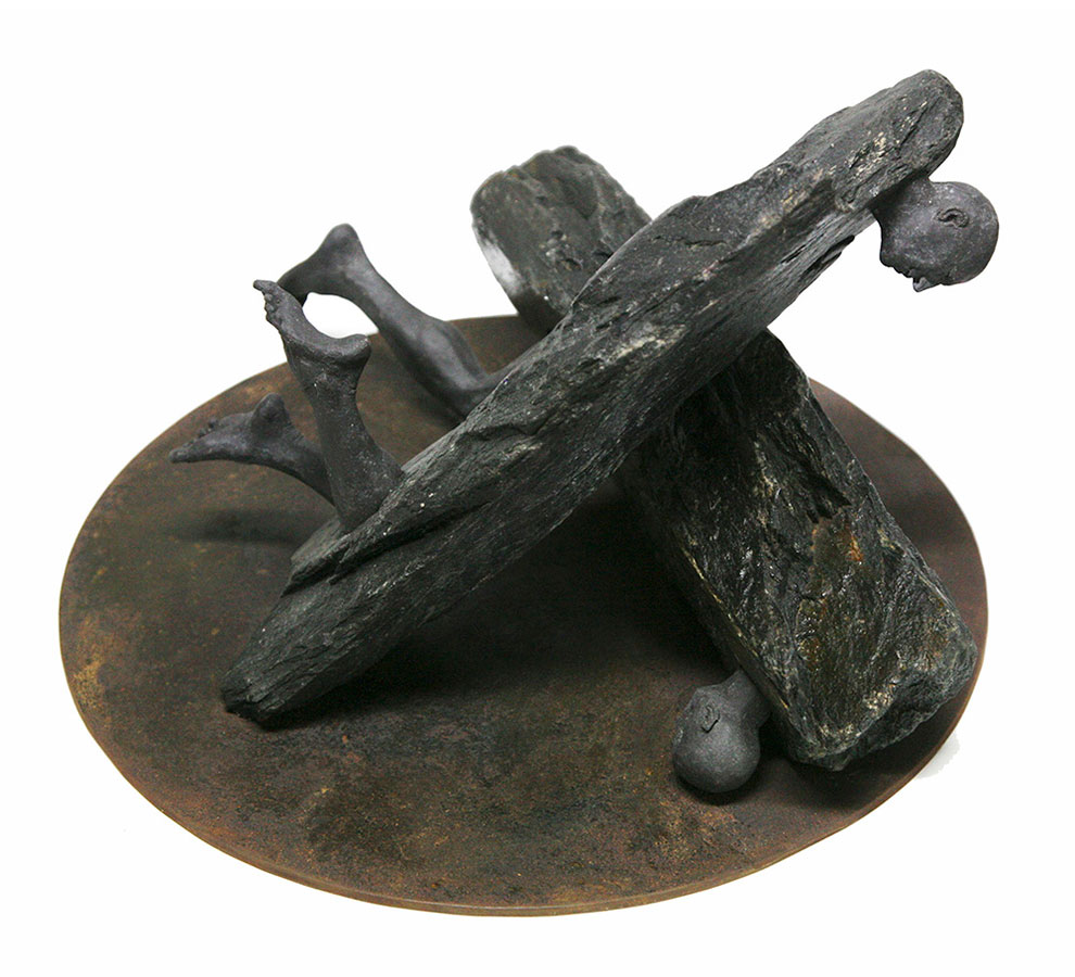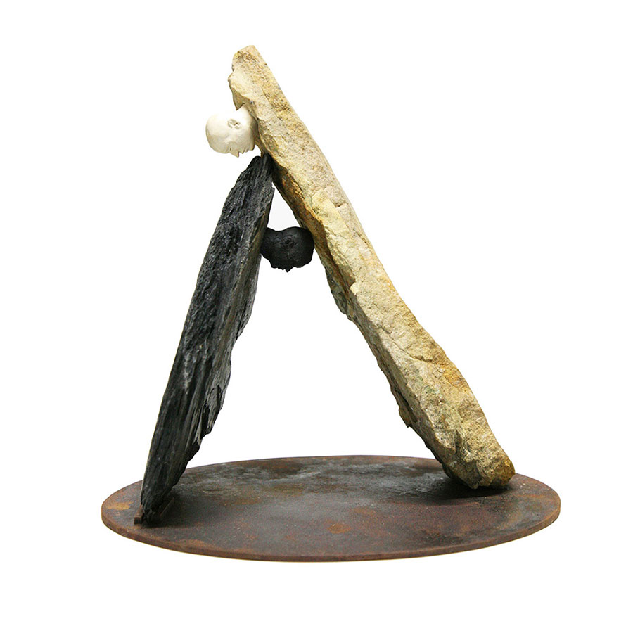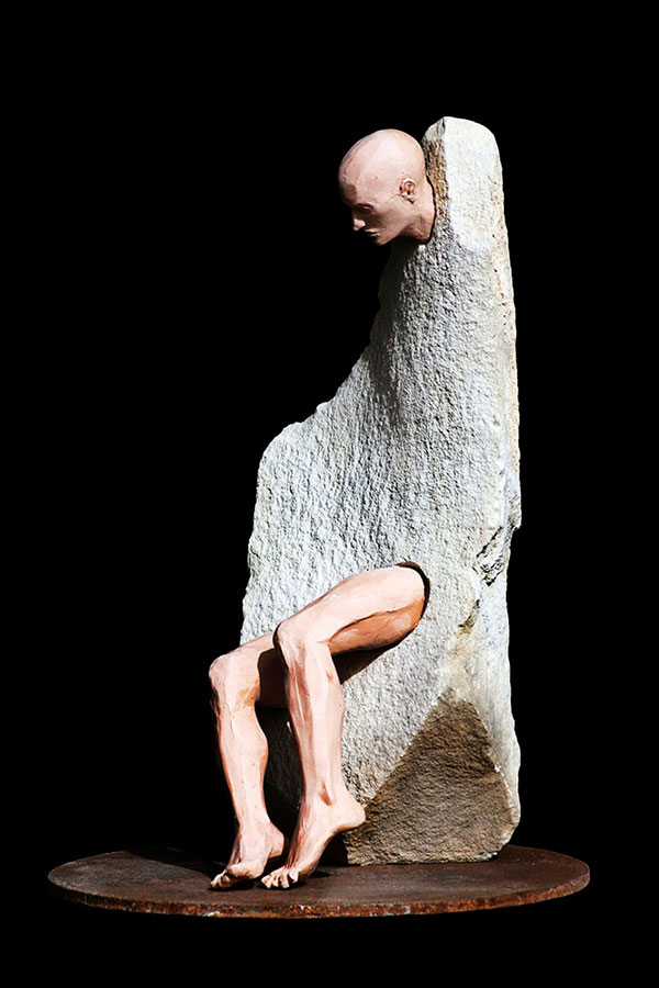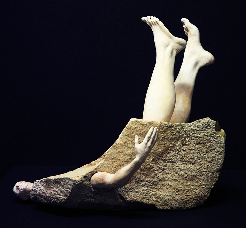 Y lo confronta con lo que, en el mundo del arte podríamos pensar que está en las antípodas; esto es, la figuración realista, que adquiere, al fusionarse con la roca o la madera encontrada, parece encontrar, además de un sentido metafórico claro, una suerte de comunión: