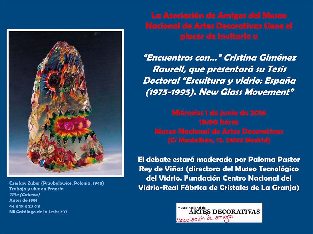 La Asociación de Amigos del Museo Nacional de Artes Decorativas organiza en el Museo de Artes Decorativas de Madrid, el miércoles 1 de junio, a las 19 horas la actividad titulada “Encuentros con…”, en la que Cristina Giménez Raurell presentará su Tesis Doctoral “Escultura y vidrio: España (1975-1995). New Glass Movement”