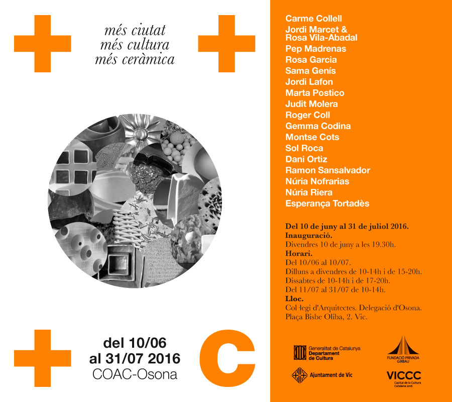Con motivo de la elección de Vic como “Ciudad de Cultura Catalana”, se ha presentado en el Col.legi d’Arquitectes de esta ciudad la exposición “+++C”, que muestra la obra de 18 ceramistas de Vic.