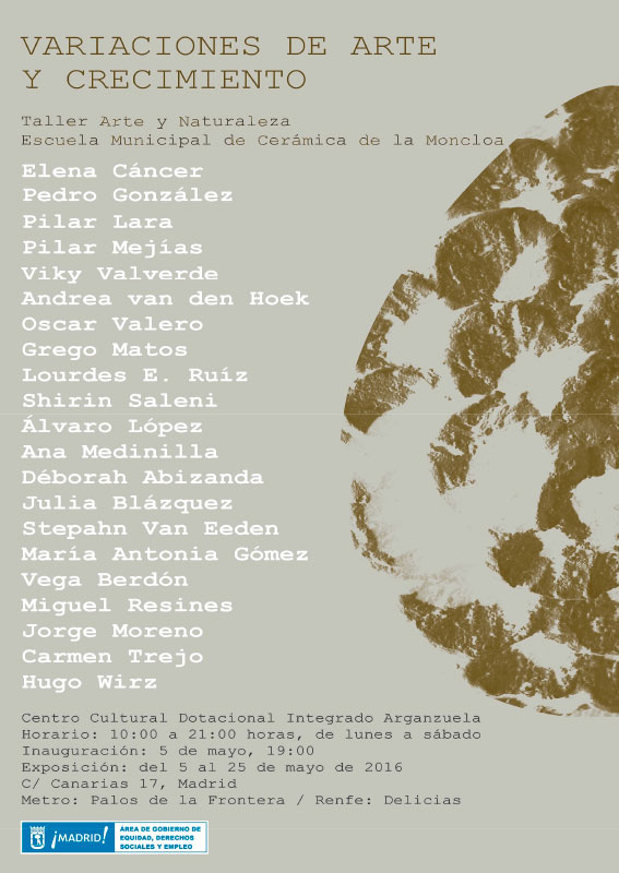 Del 5 al 25 de mayo los alumnos del Taller Arte y Naturaleza, de la Escuela de Cerámica de la Moncloa (Madrid) muestran sus trabajos en el Centro Cultural Dotacional Integrado Arganzuela, dependiente del Ayuntamiento de Madrid.