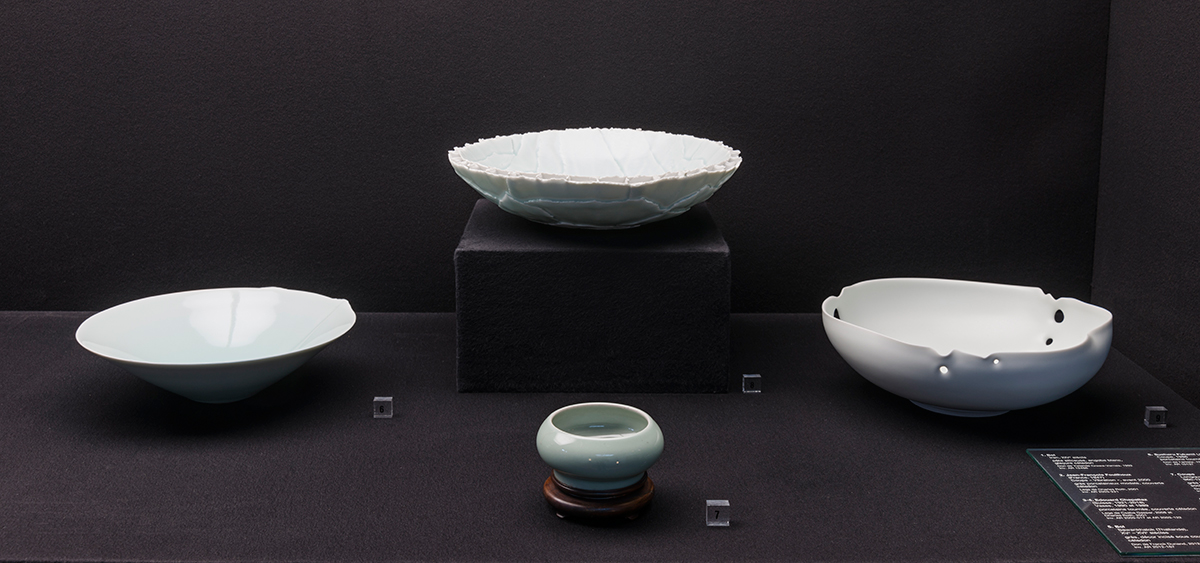 La vitrina temporal del Museo Ariana, museo suizo de la cerámica y del vidrio, presenta obras de ceramistas contemporáneos, junto a tres piezas históricas, en el primer plano, que se hacen eco de esta técnica ancestral. Según el artista Xavier Duroselle (Francia, 1962), el celadón “adquirió rápidamente sus títulos de nobleza por su capacidad para realzar admirablemente el mínimo relieve, por la profundidad de su transparencia sobre la porcelana y por la suavidad de su superficie, tan agradable al ser tocada o admirada.” Duroselle afirma que “el celadón es un intérprete: revela o atenúa…”. Las formas delicadas de sus recipientes con doble pared (placas de porcelana desgarradas superpuestas) o perforados se realzan gracias a una fina capa de celadón verde pálido apenas perceptible.