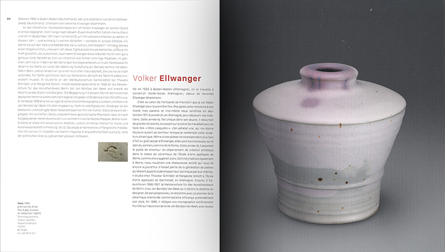El siguiente texto es quizá el más esclarecedor, ya que es el mismo Nievergelt quien nos habla de su propia trayectoria como coleccionista, una pasión que le ha acompañado toda su vida: desde las conchas que recogía siendo un niño, hasta la cerámica, pasando por los sellos o las monedas. En este texto se va desgranando la forma en que se fue haciendo la colección, su relación con los artistas, la pasión por el arte y la cerámica que le llevó a ser director del Kunshalle (Galería de arte) de la ciudad suiza de Wil, desde donde pudo trabajar para incorporar la cerámica al circuito del arte contemporáneo.