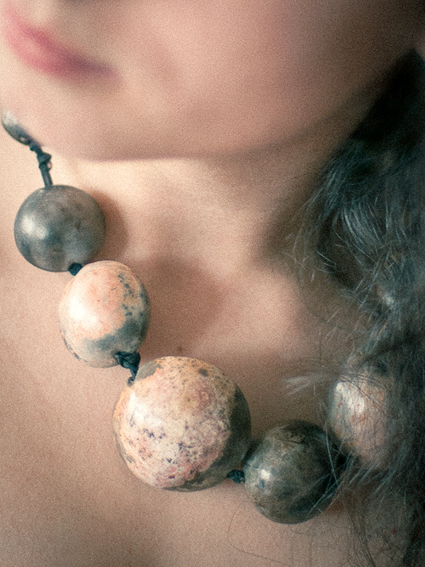 El proceso de conformación, acabado y montaje de las piezas es laborioso y delicado, tactos sedosos, proporcionados por las “terras sigillatas”, donde sus texturas visuales hace que sean objetos impactantes y fácilmente perceptibles (como las joyas). Su volumen confiere a las piezas la idea de “pesadas”, nada más lejos de la realidad, son huecas en su interior y ligeras en el uso.