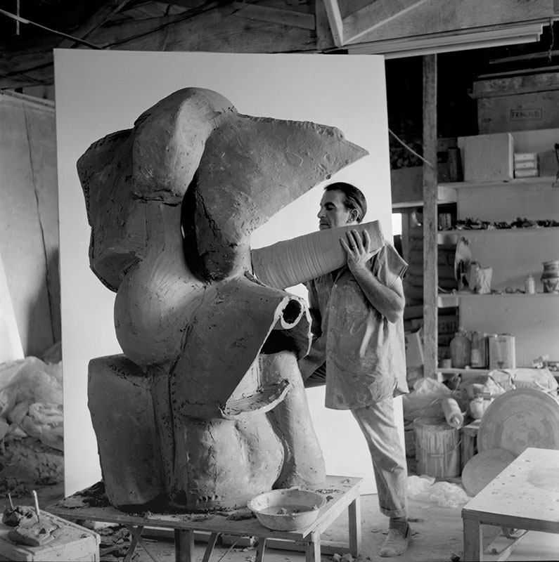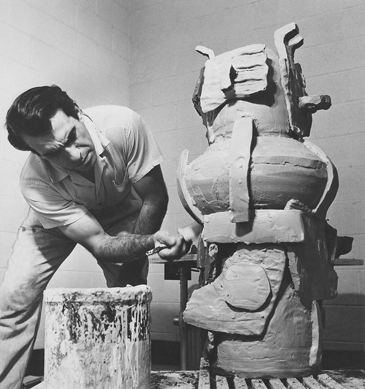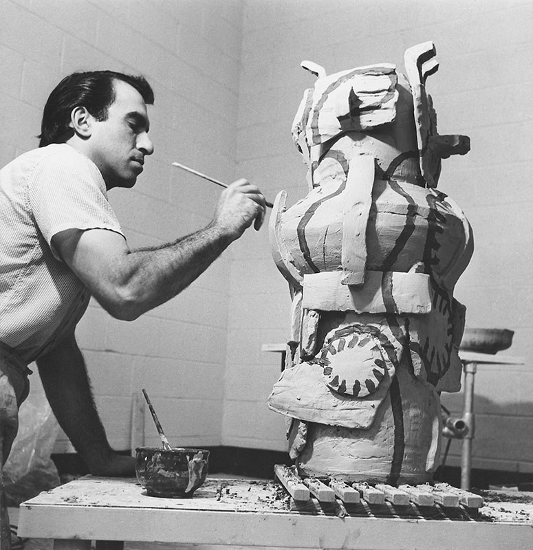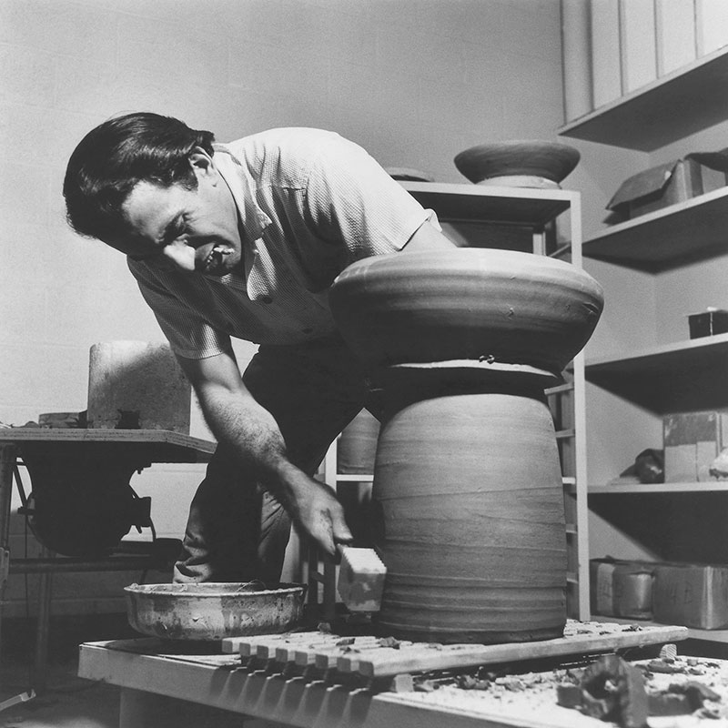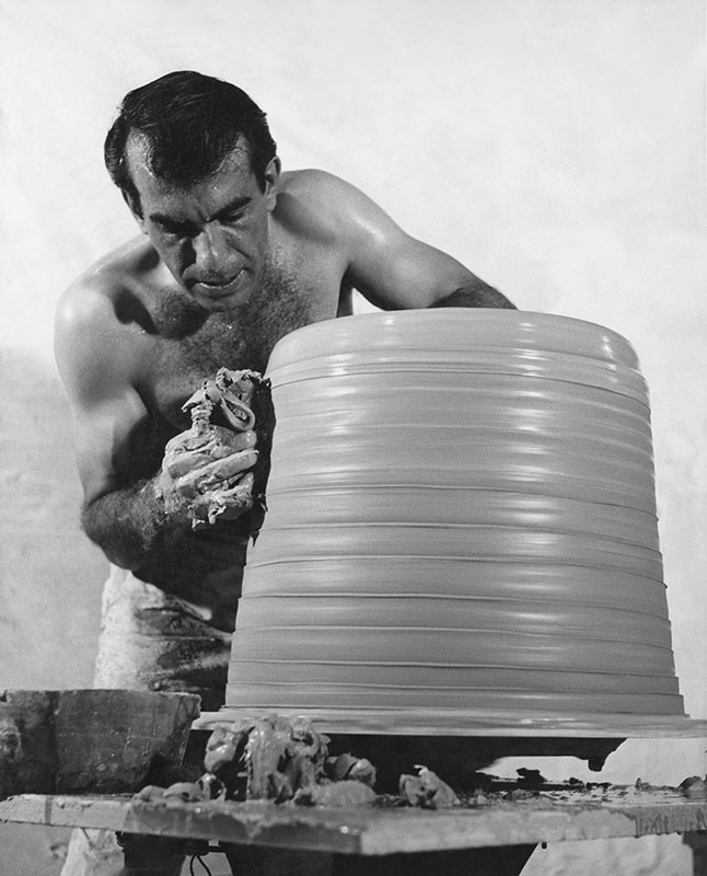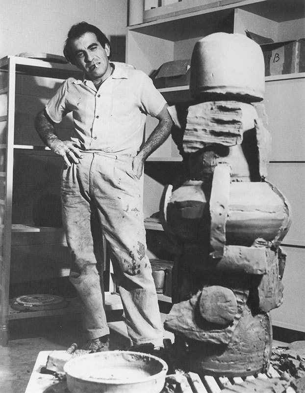 Voulkos junto a “Sitting Bull”, 1959. Glendale Boulevard Studio, Los Angeles, California, c. 1959. Fotografo desconocido. Cortesía de Voulkos & Co. Catalogue Project