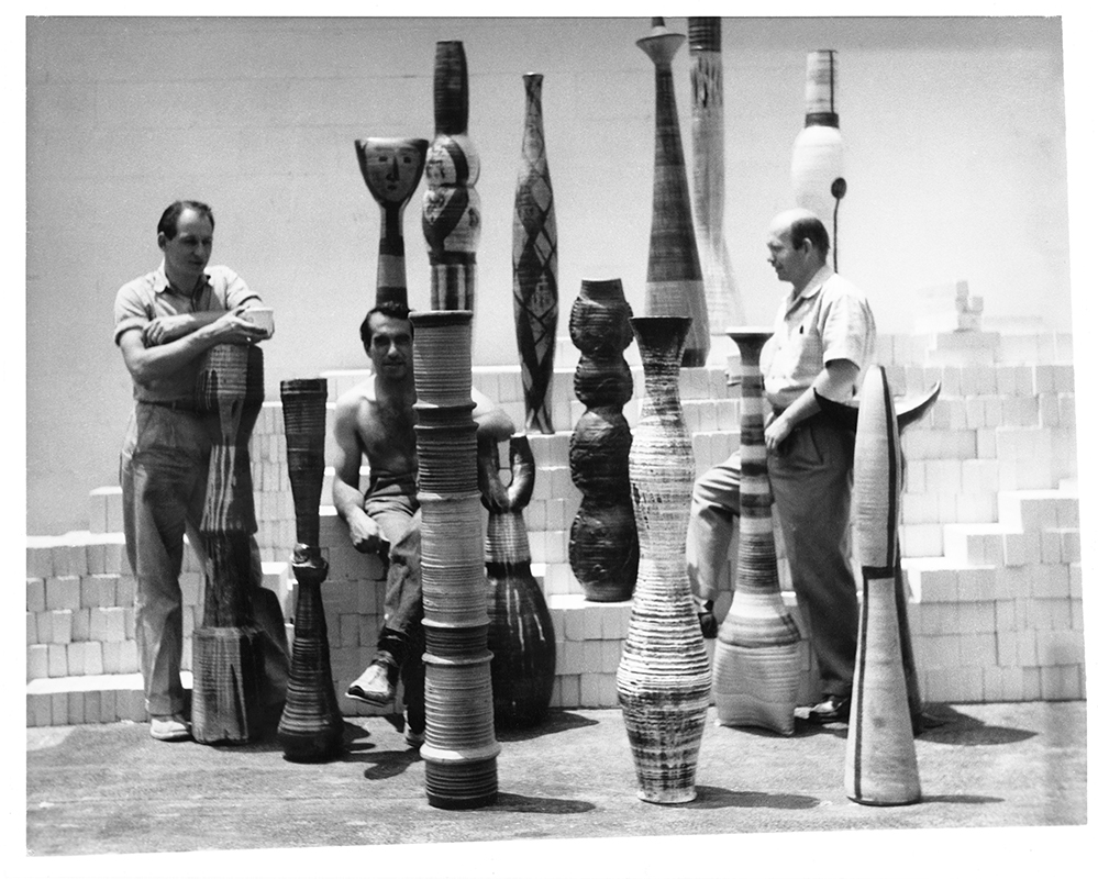 Peter Voulkos (centro) Junto a Paul Soldner (izquierda) y John Mason (derecha) en el Otis Art Institute, 1956. Imagen cortesía de Soldner Descendants’ Trust