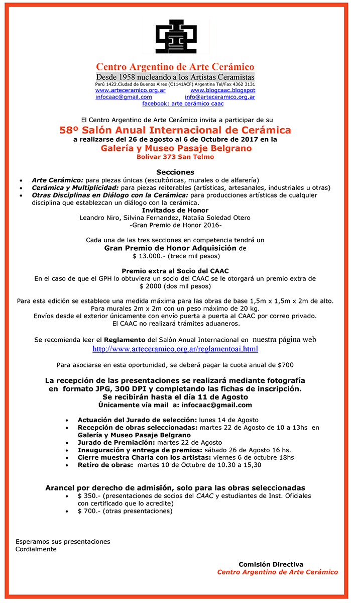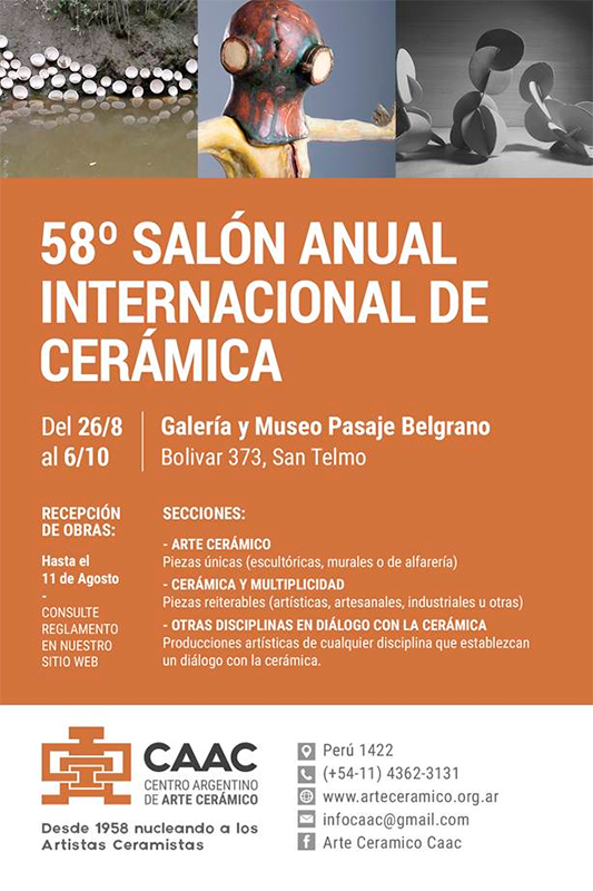 Hasta el 11 de agosto está abierto el plazo de presentación de inscripciones a este concurso de cerámica, organizado por el Centro Argentino de Arte Cerámico, que cuenta con tres categorías diferentes con unos 40.000 pesos en premios
