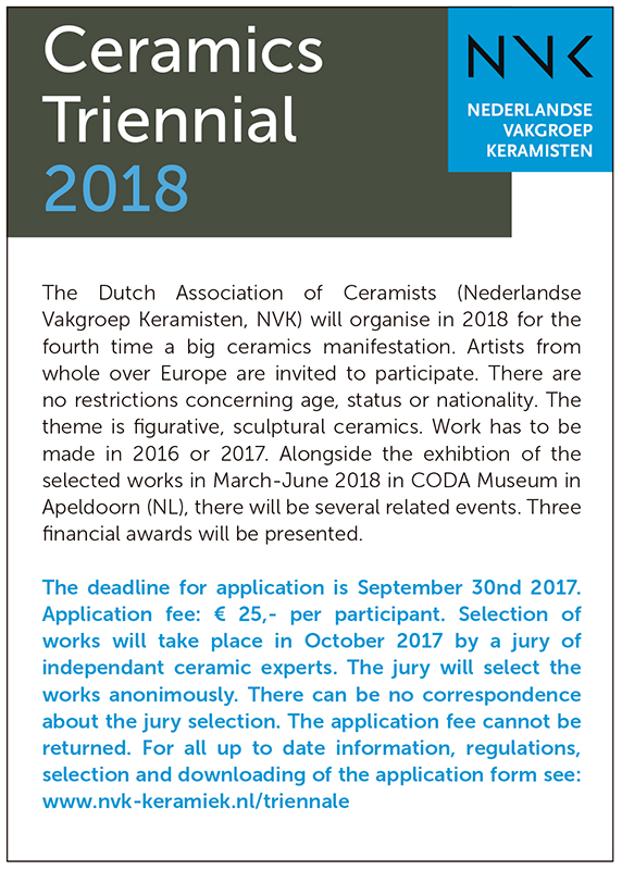 La Asociación Holandesa de Ceramistas (NVK) organizará, por cuarta vez, de marzo a junio de 2018 una gran manifestación de cerámica en el Museo CODA, de la ciudad holandesa de Apeldoorn