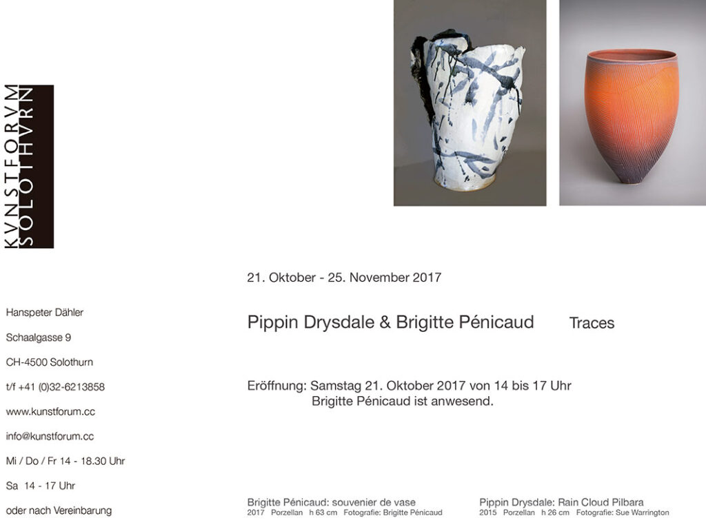 Del 21 de octubre al 25 de noviembre la galería Kunstforum, de Solothurn, Suiza, presenta la exposición de estas las ceramistas Pippin Drysdale (Australia) y Brigitte Pénicaud (Francia)