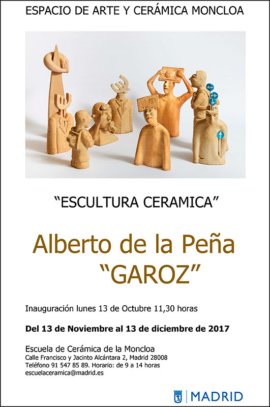 Del 13 de Noviembre al 13 de diciembre de 2017 se puede visitar en la Escuela de Cerámica de La Moncloa, en Madrid, la exposición de escultura cerámica de Alberto de la Peña, titulada “Garoz”