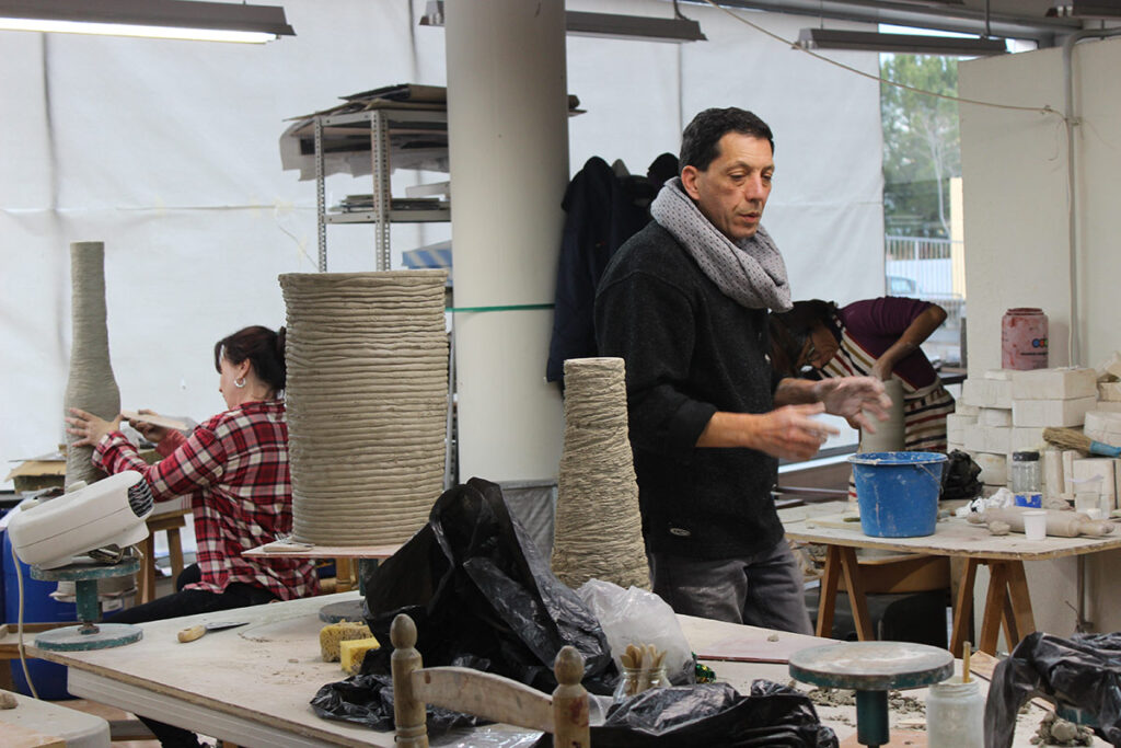En la tercera jornada se fueron desarrollando diferentes partes del mural en el taller, así como acabando de definir los volúmenes y las texturas. Las ponencias , esta vez fueron a cargo de las instituciones, comenzamos con Jordi Llop de la Escuela Superior de Cerámica de Alcora, que nos explicó sus planes de estudios, y puso sobre la mesa la importancia de incluir las nuevas tecnologías y los nuevos procesos en la cerámica artística y en la muralística. Seguidamente, fue Miguel Campos presidente de la Sociedad Española de Cerámica Y Vidrio, quien nos explico como funciona, y cómo puede ser herramienta para mejorar el posicionamiento cerámico a nivel Mundial. Y finalmente una muy interesante mesa redonda. De ella pudimos extraer diferentes conclusiones, sobre el uso de nuevas tecnologías en la cerámica, sobre la importancia de introducir la cerámica en los centros educativos, o la necesidad de juntarnos en jornadas como éstas, y un largo etcétera que nos anima a seguir trabajando por la cerámica.