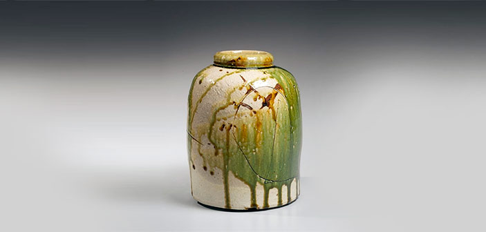Vasija de gres con esmalte Oribe verde. Circa 2000. 27,3 x 21 cm. Galería Joan B. Mirviss, Nueva York