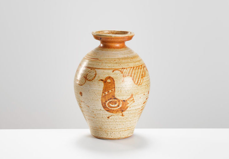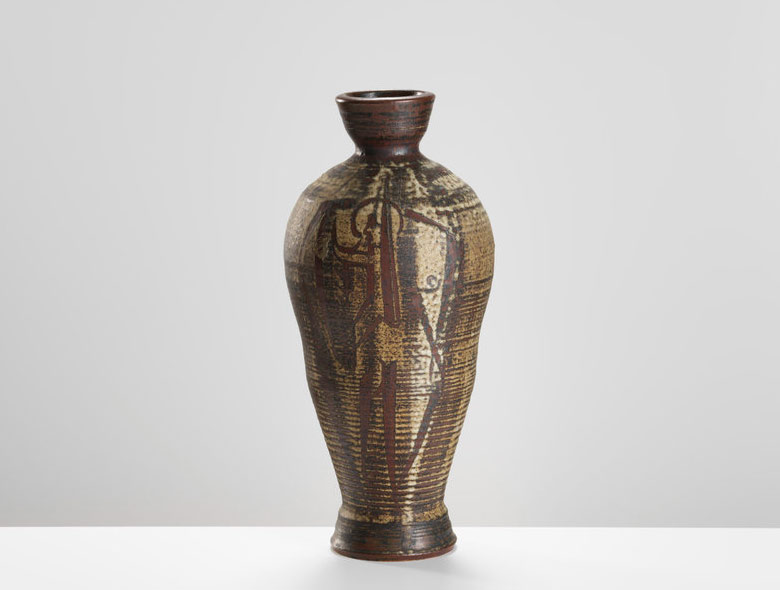 William Staite Murray (1881-1962) fue muy significativo, no solo por su tratamiento de la cerámica como forma de arte, para defenderse de la pintura y la escultura, sino por su convincente adaptación europea de las formas orientales y el uso del pincel para crear su propio lenguaje expresivo. Fue un destacado modernista inglés, que compartió exposiciones con artistas como Ben y Winifred Nicholson o Christopher Wood. Tanto los aspectos figurativos antropomórficos del estilo de Murray, como las formas gruesas de sus macetas, sus audaces terminaciones y su pincelada, fueron elementos que otorgaron a sus vasijas una considerable sensualidad, ciertamente muy escultural.