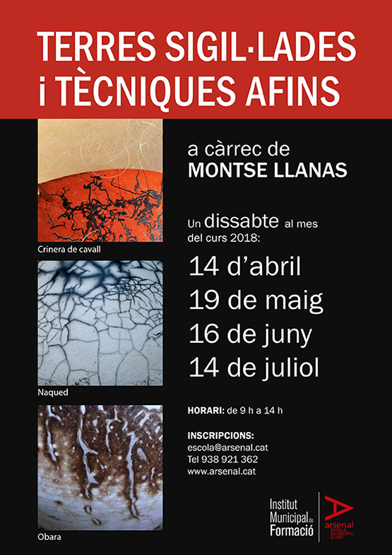 Curso de tierras sigilatas y técnicas afines como Crin de caballo, Naqued y Obvara que impartirá Montse Llamas en la Escuela Municipal de Arte Arsenal de Vilafranca del Penedès en Barcelona durante 4 sábados, 1 al mes hasta julio.