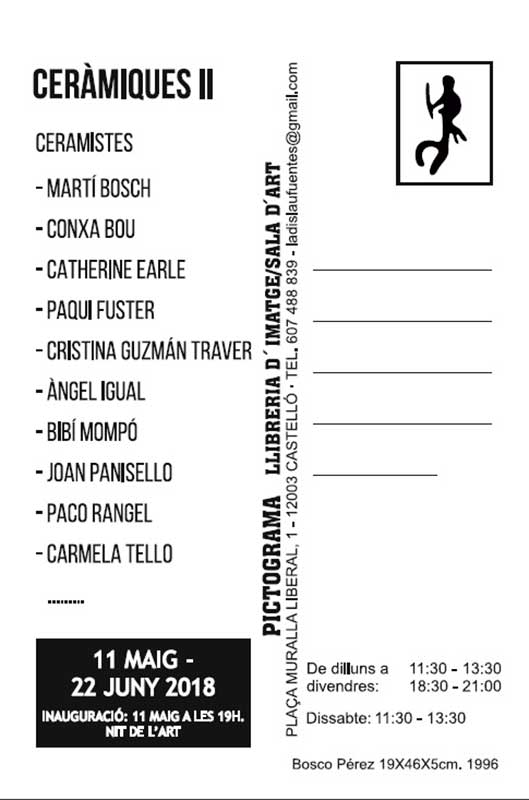 Del 11 de mayo al 22 de junio se puede visitar en la galería Pictograma, de Castellón, la exposición titulada “Ceramiques II”, en la que participan once ceramistas