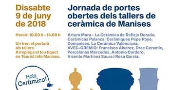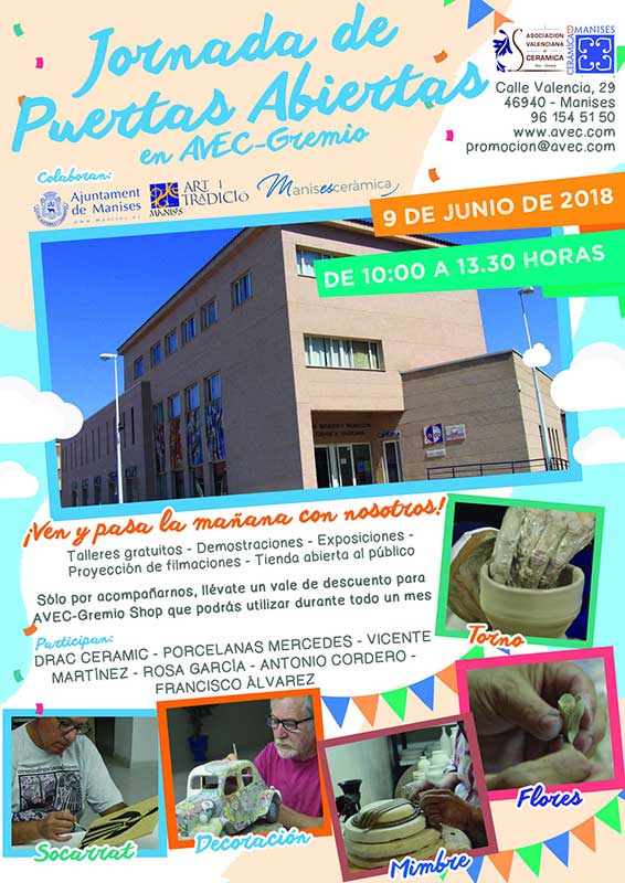 Con motivo de la celebración de “Hola Cerámica” a nivel europeo, la Asociación Valenciana de Cerámica AVEC-Gremio, con la colaboración de artesanos y ceramistas de Manises, realizará una Jornada de Puertas Abiertas el próximo día 9 de junio de 2018