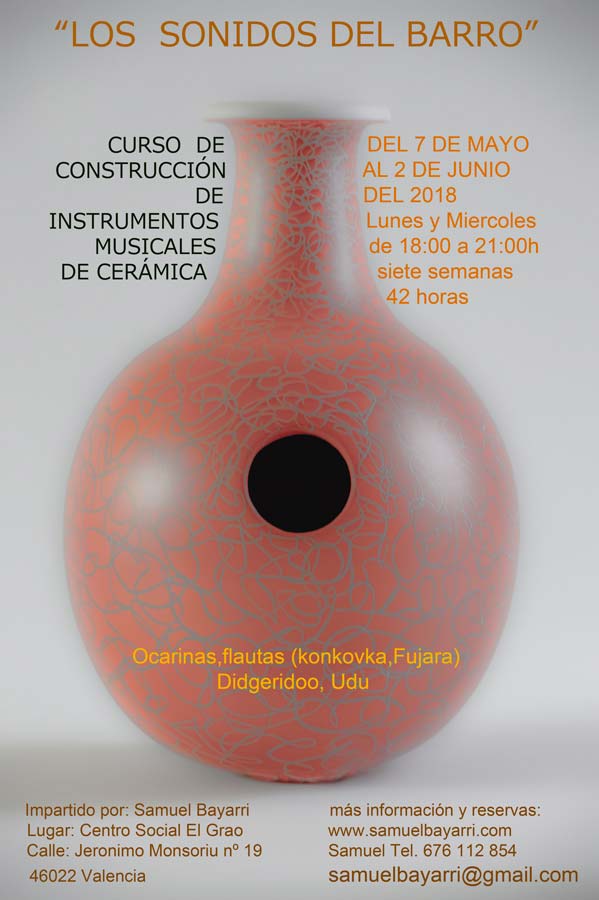 Del 7 de mayo al 2 de junio se celebrará en el Centro Social El Grao el curso “Los sonidos del barro”, dedicado a la construcción de instrumentos musicales de cerámica, impartido por Samuel Bayarri los lunes miércoles en horario de 18,00 a 21,00 horas.
