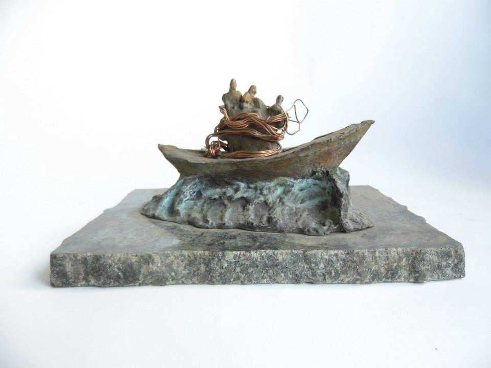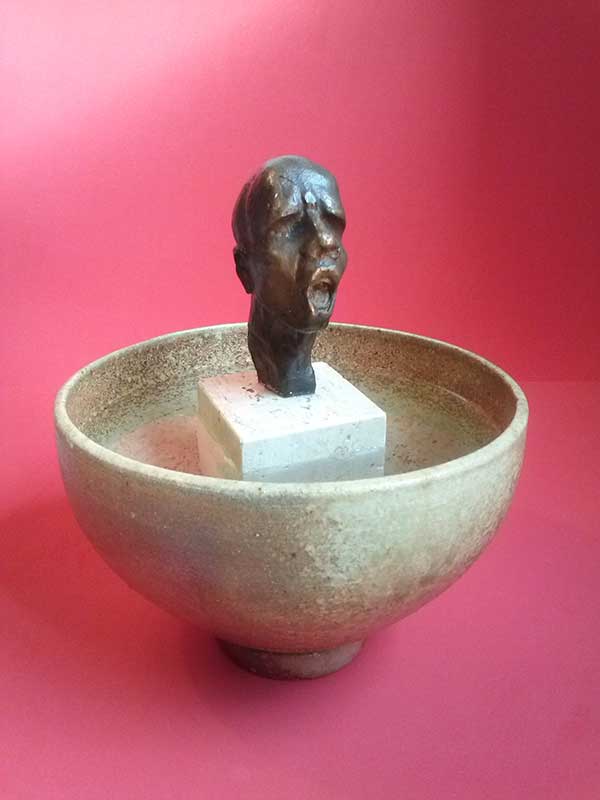 Muchas de sus obras huyen de la amabilidad formal para adentrarse en los recovecos del Pensamiento y del Alma. Son voces de Hombres y Mujeres que levantando al aire sus “Gritos” de bronce y hierro, nos recuerdan las injusticias que no cesan de existir, con volúmenes torcidos, formas escabrosas, con líneas quebradas, son Herramientas reconocibles como Palas, Hoces, yunques, etc…que han sido transformadas y metamorfoseadas para reflejar estados de angustia, dolor, desesperación y brutalidad de los trabajadores precarios, de la semiesclavitud laboral en nuestro Pais, de los que cruzan grandes distancias buscando un mundo mejor en “barquitas” y acaban ahogados en el Mar o enterrados en tumbas sin nombre en tierra de nadie. En fin “De los que han nacido, crecido y muerto siendo carne de yugo” como escribió en su poema Miguel Hernández hace muchos años y que todavía sigue vigente. Pero también en esta exposición podremos contemplar otras obras más poéticas, con mucho color, resaltando la luz en las formas de sus cerámicas y la mezcla de la pintura y el bronce, donde con formas redondeadas y suaves, nos indica que también podemos decir mucho ante el momento que nos ha tocado vivir con nuestros “Silencios y Susurros”.