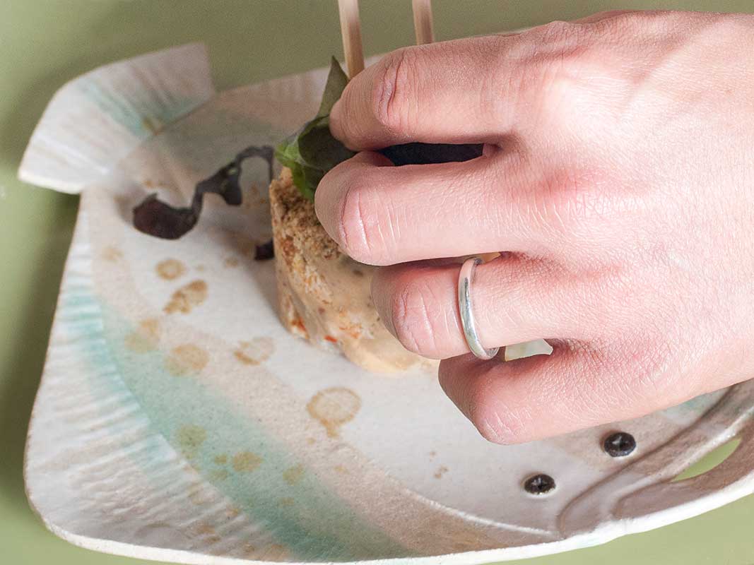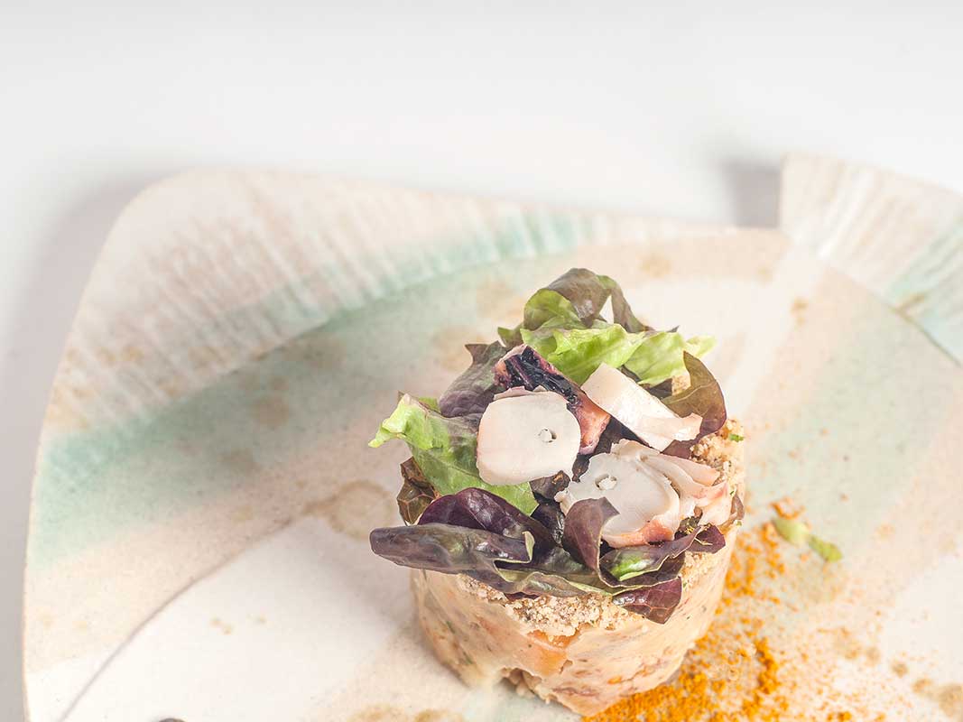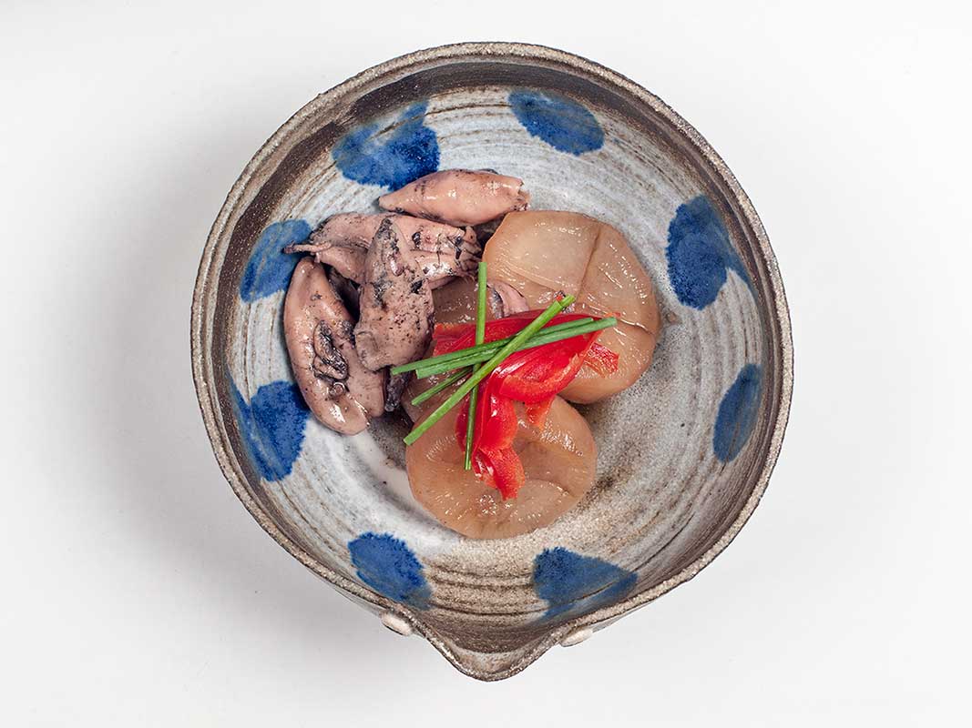 A Takashi le gusta cocinar y comer de una forma distendida, con poca parafernalia. En la «criatura» cuenco_pulpo ha emplatado “Ika Daikon”, la «criatura» natural es el chipirón o calamar en cuyo jugo se cuece el nabo blanco (daikon) que toma el sabor del primero.