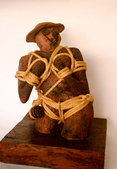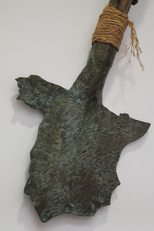 Muchas de sus obras huyen de la amabilidad formal para adentrarse en los recovecos del Pensamiento y del Alma. Son voces de Hombres y Mujeres que levantando al aire sus “Gritos” de bronce y hierro, nos recuerdan las injusticias que no cesan de existir, con volúmenes torcidos, formas escabrosas, con líneas quebradas, son Herramientas reconocibles como Palas, Hoces, yunques, etc…que han sido transformadas y metamorfoseadas para reflejar estados de angustia, dolor, desesperación y brutalidad de los trabajadores precarios, de la semiesclavitud laboral en nuestro Pais, de los que cruzan grandes distancias buscando un mundo mejor en “barquitas” y acaban ahogados en el Mar o enterrados en tumbas sin nombre en tierra de nadie. En fin “De los que han nacido, crecido y muerto siendo carne de yugo” como escribió en su poema Miguel Hernández hace muchos años y que todavía sigue vigente. Pero también en esta exposición podremos contemplar otras obras más poéticas, con mucho color, resaltando la luz en las formas de sus cerámicas y la mezcla de la pintura y el bronce, donde con formas redondeadas y suaves, nos indica que también podemos decir mucho ante el momento que nos ha tocado vivir con nuestros “Silencios y Susurros”.
