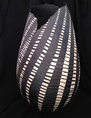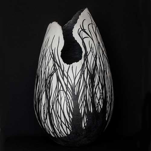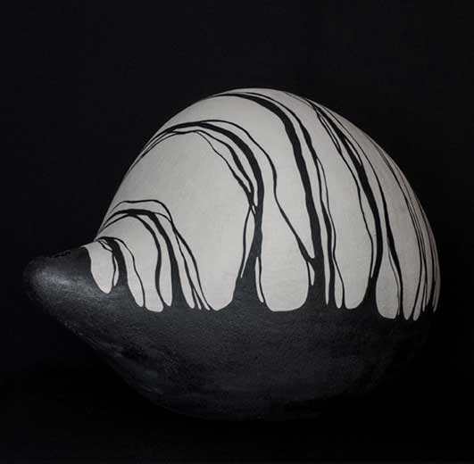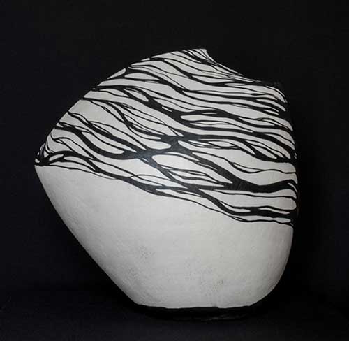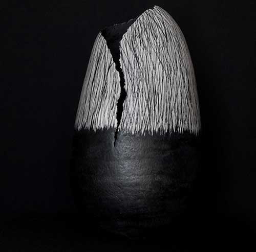“La artista en esta exposición nos presenta una serie de volúmenes de gran formato, realizados con pasta refractaria y decorados con engobes y óxidos.