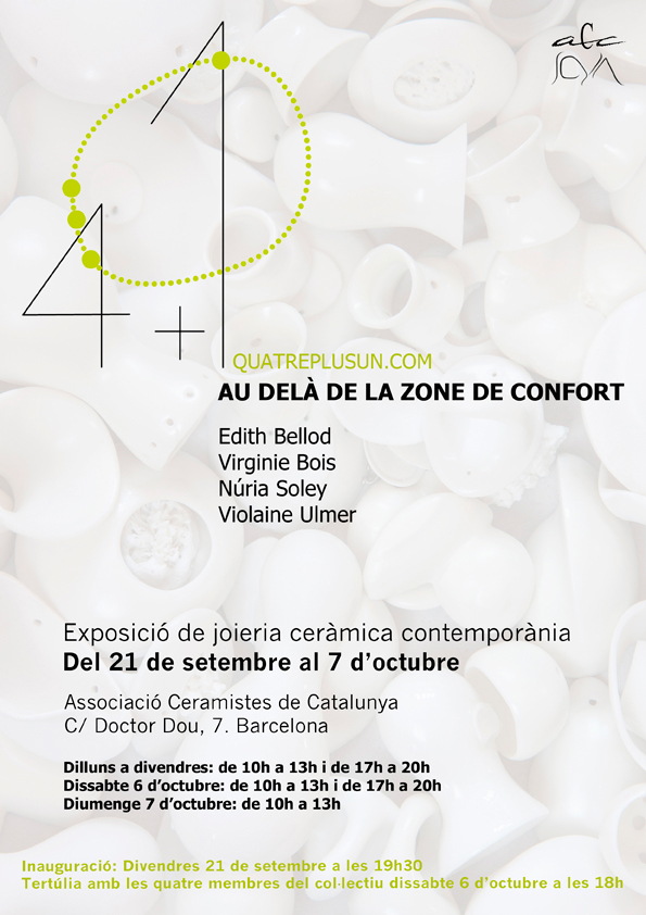 Del 21 de septiembre al 7 de octubre se presenta en la sala de exposiciones de la Associació Ceramistes de Catalunya, en Barcelona, la exposición de joyería cerámica contemporánea del colectivo “4 + 1”