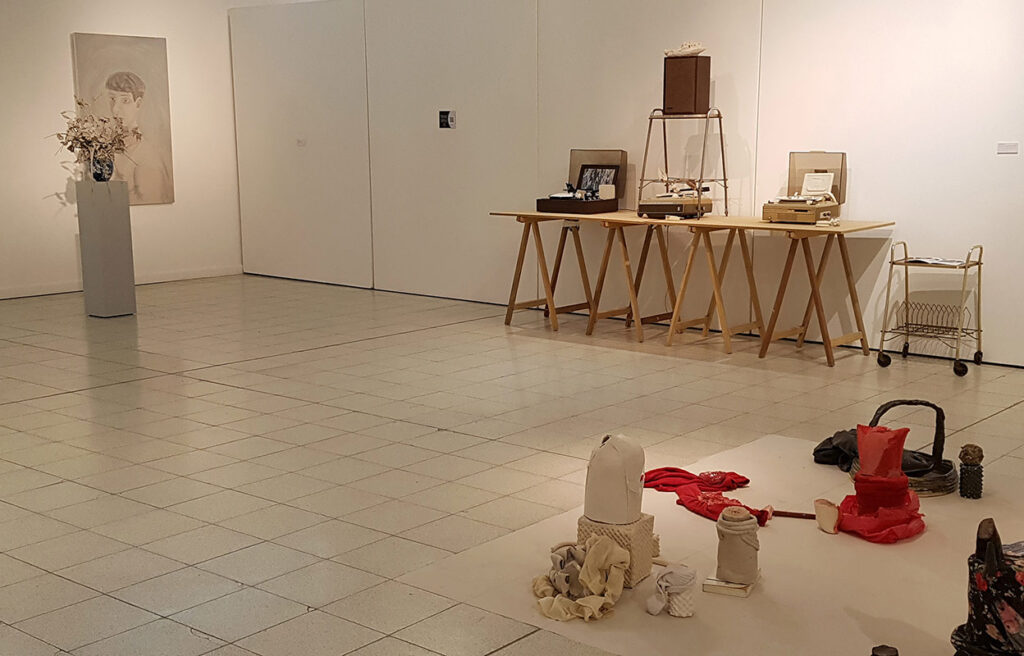 Luciana Poggio Schapiro con su obra instala en el piso de la sala cinco cuerpos construidos con ropa y materiales cerámicos que se integran desde el color, las texturas visuales, los detalles de superficie y los procesos formales. Allí la obra se establece como un dispositivo interpelador. Acciona interrogantes sobre las relaciones establecidas entre la forma, la materia y el color. Pregunta sobre la obra como signo y sobre la materialidad como significante. Sobre el color como comunicador de sentido. Dice Luciana sobre su instalación: “La propuesta se centra en una experiencia sensible con la forma, los materiales y el color. Desde el espacio íntimo del taller al espacio expositivo. Busco con estas piezas preguntarme cómo se han construido históricamente las interpretaciones asociadas a los diferentes colores. Cuestionar los sentidos que nos ligan con el color desde la materia, estableciendo una relación directa entre mi indumentaria y los materiales cerámicos (arcilla, yeso, cemento). Como comunicador de sentido muchas veces por sobre el lenguaje. A partir de un compromiso total de la experimentación con la materia generando otras relaciones que demandan otros significados”.
