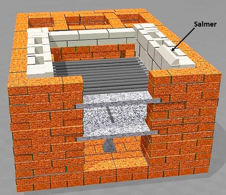 La bóveda estará formada por hiladas de ladrillos porosos JM26 cortados en cuña; tendrá un espesor de 11,5 cm (el ancho de los ladrillos); forma de arco de circunferencia y se apoyará en ladrillos con un corte inclinado, denominados “salmer”, situados en la pared exterior de los canales. La hilada central de la bóveda, que será la última que podremos, se denomina “clave”. En la figura 1 se observa la disposición de uno de los salmeres sobre los que descansará la bóveda.