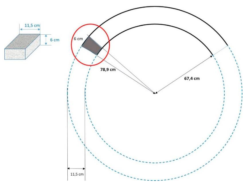 Como hemos indicado, la bóveda tendrá un espesor igual a la anchura de los ladrillos refractarios, es decir 11,5 cm, y estos deberán tener forma de cuña, apropiada para ajustarse a la curva definida. En la figura 7 se muestra de manera gráfica como construir la plantilla para cortar los ladrillos en la cuña adecuada. Para ello, se trazan dos circunferencias concéntricas, la interior de 67,4 cm de radio, puesto que este es el radio de la bóveda y la exterior de 67,4 + 11,5 = 78,9 cm (radio de la bóveda más el ancho de los ladrillos). Sobre esta segunda circunferencia se traza un arco de 6 cm (el espesor de los ladrillos) y se trazan dos radios hasta cada uno de los extremos de este arco. De esta manera, la plantilla queda delimitada por estos radios y los arcos de las dos circunferencias concéntricas.
