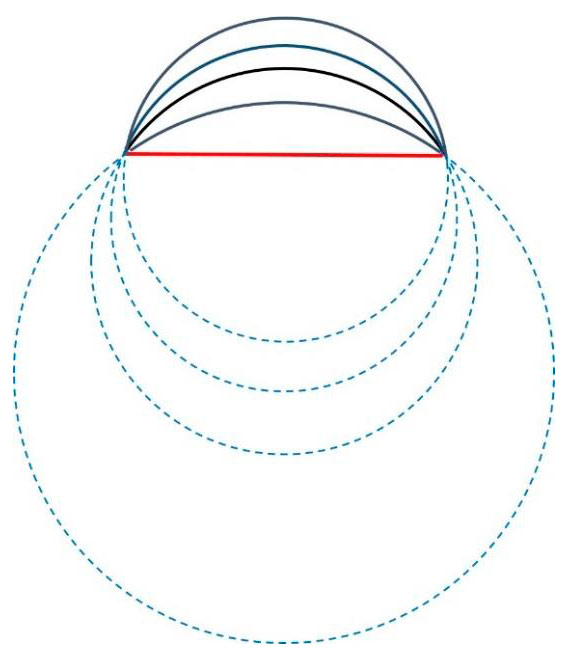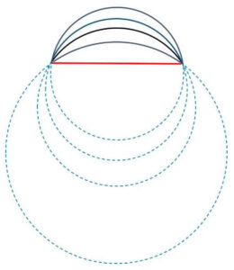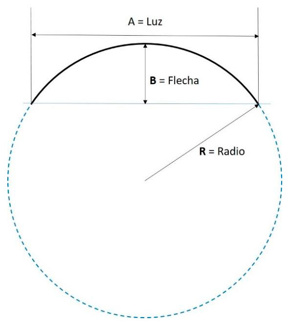 Como se sabe, entre dos puntos pasan infinitas circunferencias (figura 2) por lo que necesitamos otro parámetro, además de la “luz de la bóveda”, para definir exactamente las dimensiones de la bóveda que deseamos construir. Este parámetro se denomina “flecha de la bóveda” (B) y es la distancia entre en centro de la cuerda y el punto más alto de esta. Conocida la flecha y la luz, se puede calcular fácilmente el radio de la circunferencia que genera el arco de la bóveda. En la figura 3 se muestra una representación gráfica de estos parámetros.