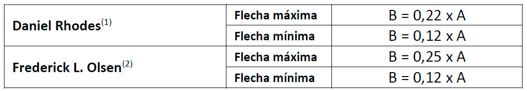 Sabemos que, en este horno, A = 70 cm. Nos falta saber B. Para ello podemos servirnos de los criterios para el cálculo de la flecha de bóveda publicados por dos autores de referencia para la construcción de hornos para cerámica artística, como son F.L.Olsen (“The kiln book”) y D. Rhodes (“Hornos para ceramistas”). En la siguiente tabla se resumen estos criterios.