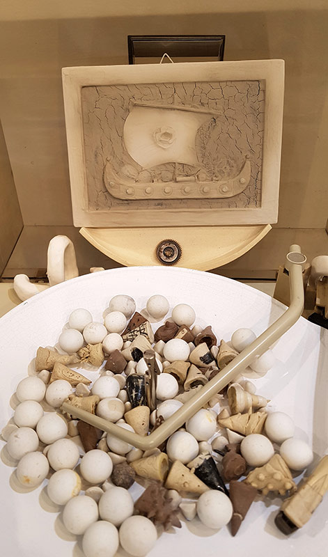 Pablo Insurralde presenta un proyecto de instalación con varios objetos de cerámica esmaltada, donde leves movimientos mecánicos producen un choque permanente entre ellos. Estos pequeños roces provocan un sonido sostenido que inquieta y nos hace pensar en una acción riesgosa. ¡¡Se podrían romper!! Pero la repetición sutil de movimientos y choques, finalmente desgasta la superficie y revela un material cerámico frágil y a su vez resistente. Pablo dice: “La obra busca poner a la cerámica en un contexto de vulneración donde se exponga su fragilidad. A través de los esmaltes empleados la obra da una falsa apariencia de piezas metálicas, pero debido al roce entre ellas y a su posterior erosión, se descubre progresivamente su verdadera materialidad cerámica”. Con su proyecto el artista nos lleva a un lugar incómodo, el de la fragilidad de la cerámica. Parece metal, parece fuerte e irrompible, pero en realidad es cerámica y lo que nos incomoda es que se rompa y revele lo natural. La cerámica se rompe. Tiene esa bella propiedad: la fragilidad.
