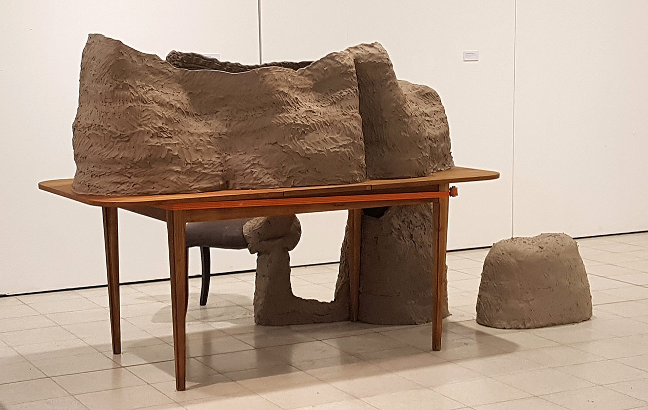 Eugenia Bracony nos interpela con su instalación “Autorretrato”. Nos invita a ubicarnos frente a una mesa y una silla casi tapadas de construcciones hechas a mano con barro crudo. Esta operación obtura la funcionalidad de los muebles, y nos incomoda. Incomodando, Eugenia construye una escena íntima y autorreferencial en la que decide mostrar-se a través de la conexión entre la arcilla cruda (con su imponente materialidad) y los dos objetos muebles que remiten a su vida cotidiana (casa-taller). Escribe sobre su obra “el autorretrato siempre tiene algo de íntimo y algo de público, una tensión evidente entre exponerse y distanciarse. Se muestra y se oculta siempre algo. Este caso no es diferente, es mostrar un instante, una percepción personal, la subjetividad de un momento, una fracción, un impulso, una entelequia”.