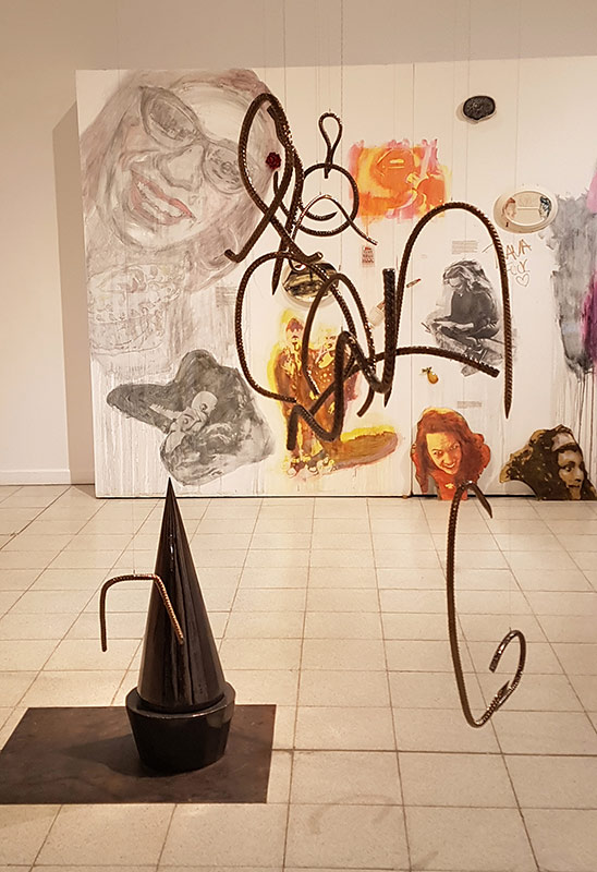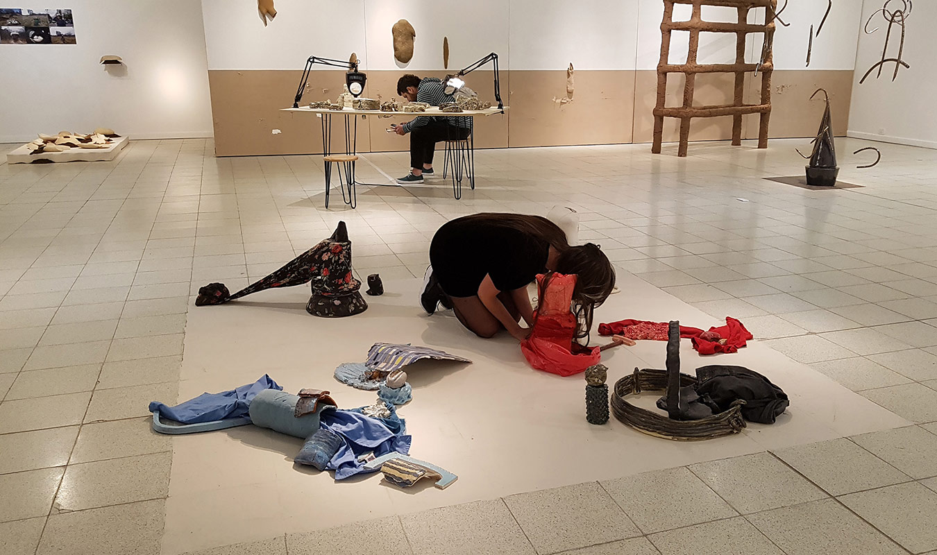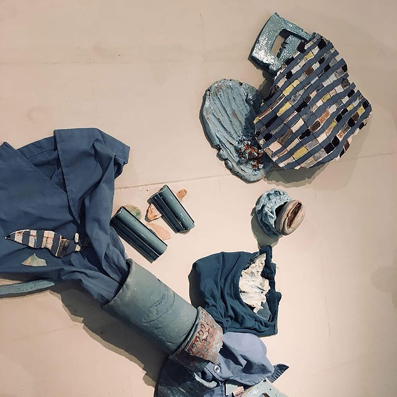 Luciana Poggio Schapiro con su obra instala en el piso de la sala cinco cuerpos construidos con ropa y materiales cerámicos que se integran desde el color, las texturas visuales, los detalles de superficie y los procesos formales. Allí la obra se establece como un dispositivo interpelador. Acciona interrogantes sobre las relaciones establecidas entre la forma, la materia y el color. Pregunta sobre la obra como signo y sobre la materialidad como significante. Sobre el color como comunicador de sentido. Dice Luciana sobre su instalación: “La propuesta se centra en una experiencia sensible con la forma, los materiales y el color. Desde el espacio íntimo del taller al espacio expositivo. Busco con estas piezas preguntarme cómo se han construido históricamente las interpretaciones asociadas a los diferentes colores. Cuestionar los sentidos que nos ligan con el color desde la materia, estableciendo una relación directa entre mi indumentaria y los materiales cerámicos (arcilla, yeso, cemento). Como comunicador de sentido muchas veces por sobre el lenguaje. A partir de un compromiso total de la experimentación con la materia generando otras relaciones que demandan otros significados”.