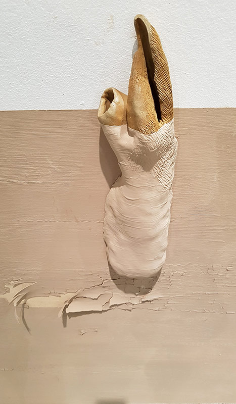 Lucía Delfino, con “Nos miro de afuera”, un título inquietante, nos detiene en una gramática fallida que potencia el clima poético de la obra. Una instalación que nos hace parte de un mundo íntimo y ficcional donde el barro se vuelve materia divina. Ya no ensucia, tampoco tapa. Aparece como un elemento develador. Así conceptualiza su trabajo Lucía: “Un arreglo floral, sumergido, pintado, cubierto en barbotina. Una pintura con el retrato de una persona, realizado también con barbotina levemente coloreada. Ambos se encuentran como suspendidos en un mismo estado de ánimo, rígidos y en reposo, mientras esperan tal vez echarse a perder. El material con el que se encuentran hechos refuerza lo inexorable del paso del tiempo, de la transformación, a la vez que intenta inútilmente fijarlo, endurecerlo. Dentro y fuera del retrato, la figura y las flores dialogan entre sí acerca del carácter de la representación. Las flores, como objeto real, se vuelven representación al ubicarse ahí, la arcilla refuerza en su gesto y al cubrirlas, su nuevo carácter ficcional. Los ojos del personaje, dirigidos hacia el arreglo, lo intentan despegar de la bidimensión y en cierta forma, de su carácter de representación”.