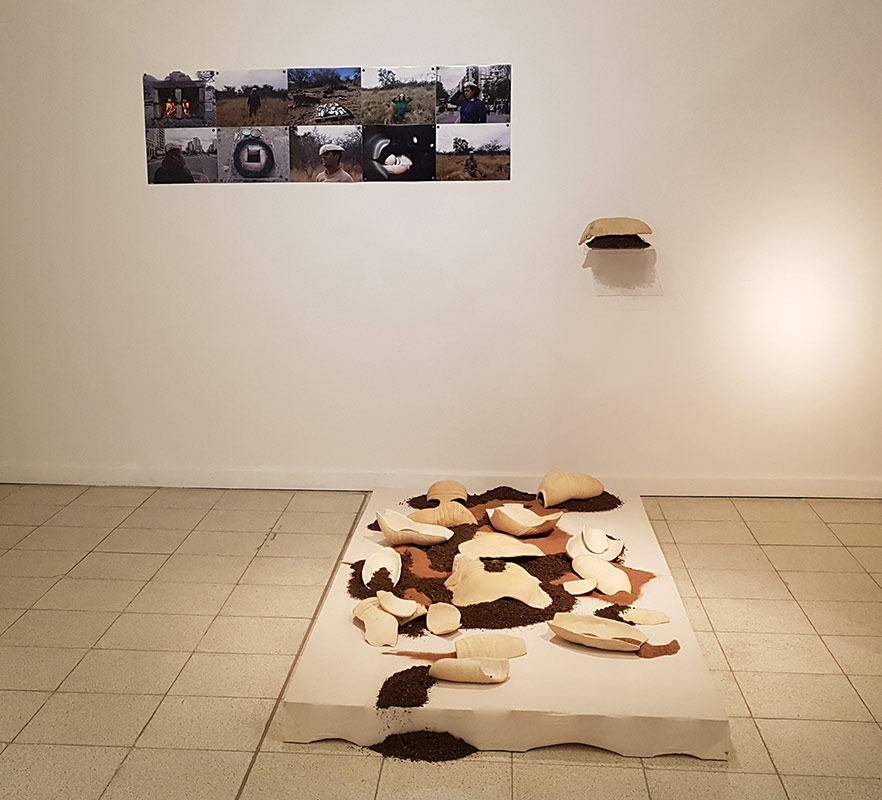 Mercedes Fidanza presenta “Armadilla”, una obra que nos habla de las migraciones permanentes de los seres vivos, de los cambios, desarraigos y sufrimientos que conlleva la migración. Mercedes construye una instalación donde articula diversos elementos cerámicos que operan como una armadilla/armadura de protección. Define su trabajo de la siguiente manera: “Armadura de piezas hechas con reproducciones del caparazón de una mulita. Tomar la copia y su reproducción seriada como la posibilidad de expansión de esa mulita sobre un cuerpo, generando capas para ser amoldadas al cuerpo propio o ajeno, como una posible armadura de defensa ante los peligros que cualquier migrante siente o percibe durante sus movimientos por el territorio/frontera que transita o habita. Una mulita hallada en el desierto de sal, en las Salinas Grandes, me trajo historias de migraciones en el interior del país, y me llevó a preguntar y reconocer mi propia migración presente desde la ciudad hacia el campo. La obra es un nuevo territorio a donde migrar con estas experiencias”.