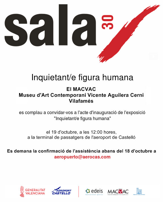 La galería de arte ‘Sala 30’ del aeropuerto de Castellón inaugurará el próximo viernes su tercera exposición, que consta de una decena de piezas cerámicas y pictóricas unidas por la temática de la figura humana; una figura, en este caso, enigmática y perturbadora. En este sentido, la muestra, que se prolongará hasta el próximo 29 de abril, lleva por título “Inquietant/e figura humana”.