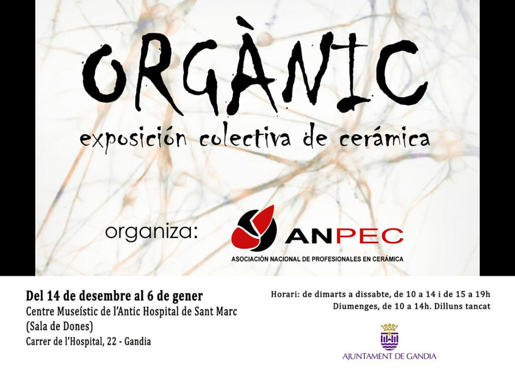 “La Asociación Nacional de Profesionales en Cerámica ANPEC es una asociación cultural de 130 miembros de toda España, que se constituyó en enero de 1990 como Asociación de Peritos en Cerámica Artística y Peritos en Técnica Cerámica, con la intención de dar a conocer la cerámica al público en general y además promocionar los intereses económicos, sociales y culturales de sus asociados, tanto en el ámbito técnico como artístico. Como no puede ser de otro modo, nuestra sede social se ubica en la Escuela de Arte y Superior de Cerámica de Manises (ESCM), desde donde trasladamos nuestra nueva exhibición Orgànic al Centro Museístico Antiguo Hospital de Sant Marc de Gandía.