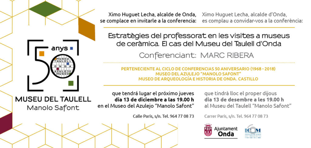 Con motivo del 50 aniversario (1968-2018) del Museo del Azulejo “Manolo Safont” y Museo de Arqueología e Historia de Onda, os invitamos a la próxima conferencia que tendrá lugar el 13 de diciembre a las 19.00 h:
