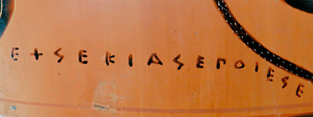Existen en el mundo solo catorce cerámicas con la leyenda “Exekias me hizo”, en las que la propia pieza prueba la autoría, incluso en tres de ellas la leyenda dice “Exequias me pintó y me hizo”, con lo que el autor probablemente se diferenciaba de otros artistas que, en unos casos solo hacían la forma, y otros que solo lo pintaban.