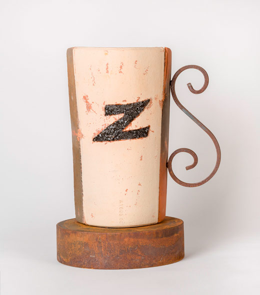 Pintor, escultor y dibujante extraordinario, Arroyo siempre ha sentido una fascinación por la cerámica. Sus series de platos de los años 70 –muy conocidos en Italia, país en el que entonces vivía- se han convertido en clásicos dentro de su obra. Sus esculturas hechas a partir de tejas, dejaban ver la libertad con la que Arroyo se movía entre las diversas técnicas. La lámpara James Joyce (1993) es un ejemplo perfecto: realizada en bronce, madera y cerámica, incorpora una bombilla convirtiéndose en una pieza extraordinaria.