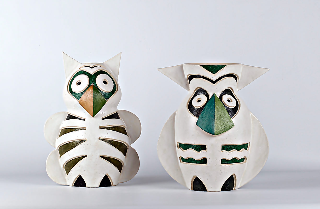 La segunda serie de la exposición es un conjunto de diez jarrones de cerámica con forma de búho, un ave por la que Arroyo sentía pasión. La colección ha sido realizada en colaboración con el ceramista Francisco Gálvez, que trabaja habitualmente con nuestra galería. Este trabajo a cuatro manos –como el desarrollado por Miró con Artigas- ha dado como fruto un conjunto de diez jarrones de gres con esmalte llenos de colorido e ironía.
