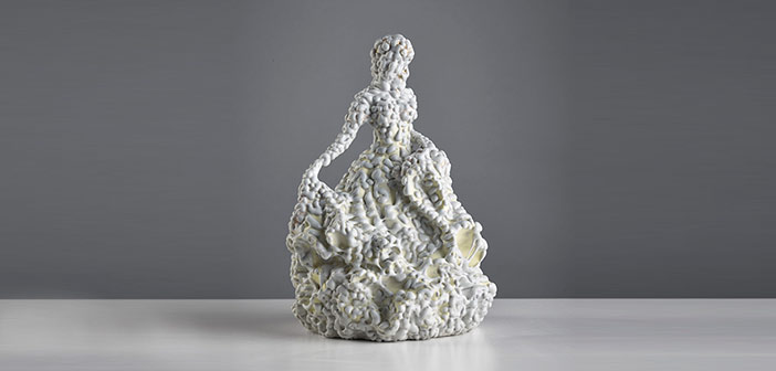 “Royal Doulton Classics Sweetheart HN 4319 waistcoat mark”, 2017. Porcelana de huesos, esmalte, lustre dorado. 14 x 15 x 21 cm. (Foto: John McKenzie.)
