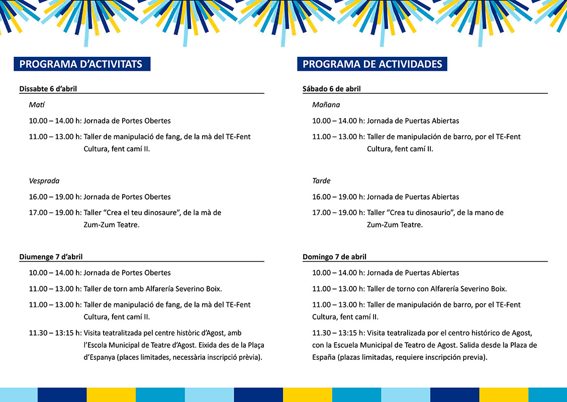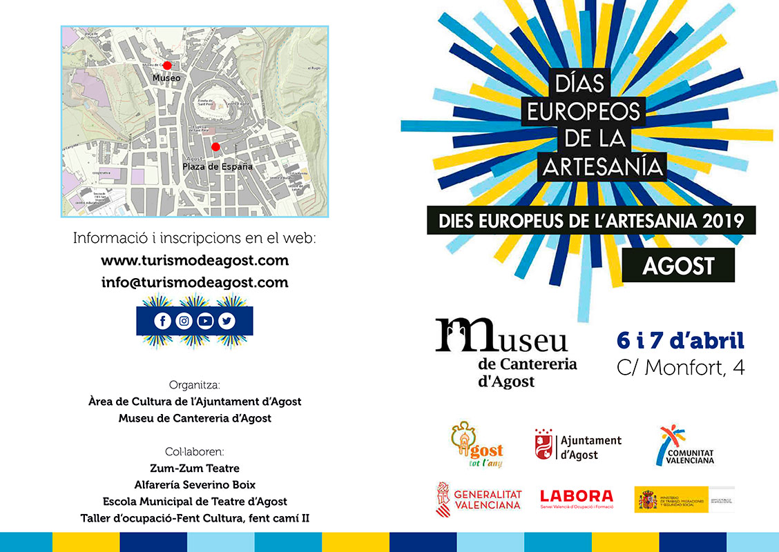 Con motivo de la celebración de los Días Europeos de la Artesanía en todo el continente, el Ayuntamiento de Agost (Alicante), se suma un año más con un fin de semana lleno de actividades para todos los públicos donde la artesanía, especialmente la cerámica, será el hilo conductor. Los próximos 6 y 7 de abril, en el Museo de Alfarería se podrá disfrutar de talleres de torno, de manipulación de barro, así como de manualidades, con el fin de acercar al gran público el trabajo con la arcilla. Asimismo, se realizará una visita teatralizada por el centro histórico, recorriendo los lugares más emblemáticos donde el oficio alfarero ha dejado su huella. Un fin de semana para reivindicar la artesanía y la cerámica.