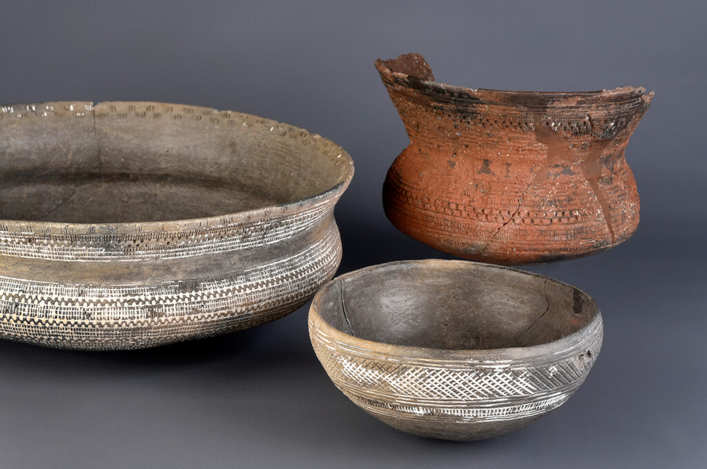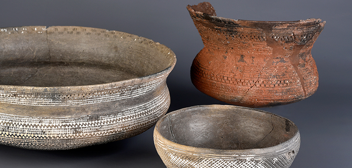 Foto: Conjunto característico del ajuar cerámico campaniforme: vaso, cuenco y cazuela procedentes del yacimiento de La Salmedina (Vallecas, Madrid). El barroquismo de su minuciosa decoración es característico del tipo “Ciempozuelos” (por el yacimiento madrileño homónimo), propio del campaniforme maduro del interior peninsular. (Foto: Mario Torquemada / Museo Arqueológico Regional)