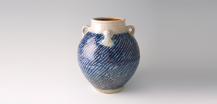 Jarrón con asas, marcas de cuerdas y engobe con esmalte salino azul cobalto.