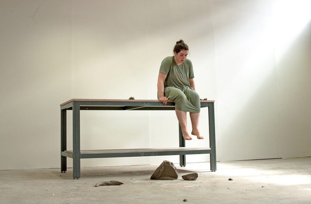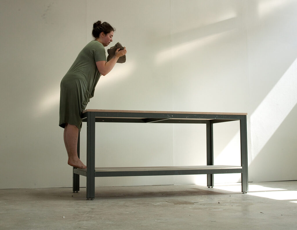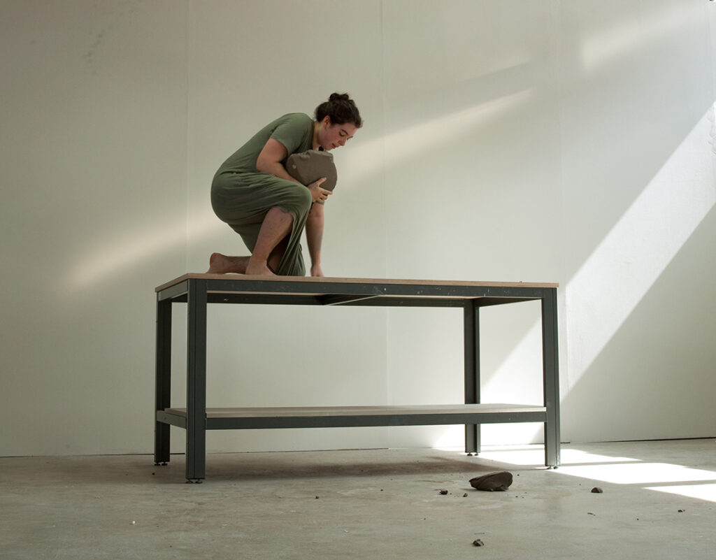 Exploro mi relación con la arcilla y cómo obliga a mi cuerpo a hacer ciertas cosas. Hago esto para enfatizar el momento entre yo misma, el artista, el material y la complejidad de esta relación.