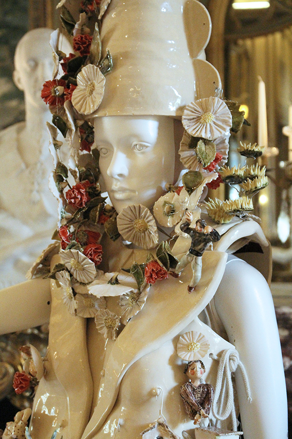 La representación cerámica viene del body LIMOSNA, como se llama la creación del rambleño Luis Torres, compuesto por tres piezas principales de cerámica, de las que cuelgan decenas de figuras policromadas en miniatura que representan a niños jugando y bailando flamenco en las calles y los rincones silvestres de un típico pueblo andaluz. A la dificultad técnica de estas piezas se le añade un gorro del que cuelgan guirnaldas de flores, todo de cerámica. Un delicado trabajo que su autor define como un reto técnico y creativo, pero de los más bonitos que ha hecho en su corta carrera. Hecho totalmente a mano mediante el modelado sobre un maniquí, en pasta de papel con gres de chamota fina para aligerar el peso y facilitar la consistencia y el modelado y esmaltado a 1210ºC; el principal reto técnico era hacer encajar todas sus piezas entre sí y con la talla del maniquí original debido a la contracción y el movimiento de la cerámica en las distintas cocciones.