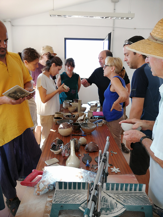 La mañana del viernes la dedicamos a una clase teórica sobre los diferentes tipos de hornos de leña en Oriente y Occidente, centrándonos en los hornos más utilizados por los ceramistas de estudio, y muy especialmente los que están pensados para alcanzar alta temperatura. Posteriormente se esmaltaron las piezas y se preparo la construcción del horno.